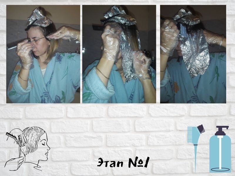 3. Каждую начесанную прядь я сначала промазывала пальцами, слегка растушевывая в зоне перехода, не заходя на темные волосы. После обертывала в фольгу. Итак, 3 пряди (сверху вниз).