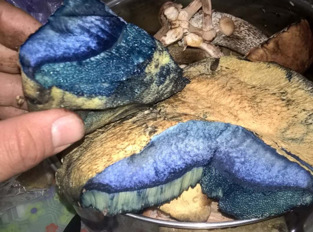 Пару лет назад этот гриб часто встречался на востоке Подмосковья. Снаружи он напоминает нечто среднее между белым грибом и маслëнком. Срезав его или надломив, в месте повреждения он сразу начинает синеть, причём краски настолько яркие, что начинает казаться, как будто из него сейчас потекут чернила. Изначально я не знал, что это за гриб, но всё равно принёс его домой, после чего долго гуглил