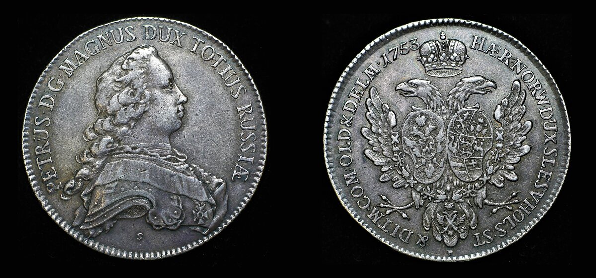 Реверс. Тут все тоже очень интересно. Российский двуглавый орел, имеющий над головами имперскую корону, но лишенный скипетра и державы в лапах, несет на своей груди два овальных щита: один — с гербом Российской империи, другой — с геральдическим знаком Шлезвиг-Гольштейнского герцогства. На шее державной птицы мы видим цепь ордена Андрея Первозванного. Надпись круговой легенды читается как HAER: NORW • DUX SLESV HOLS: ST : & DITM COM : OLD & DELM • 1753, и переводится следующим образом: Наследник Норвегии, герцог Шлезвиг-Гольштейна, Штормарна, Дитмаршена, граф Ольденбурга и Дельменхорста.