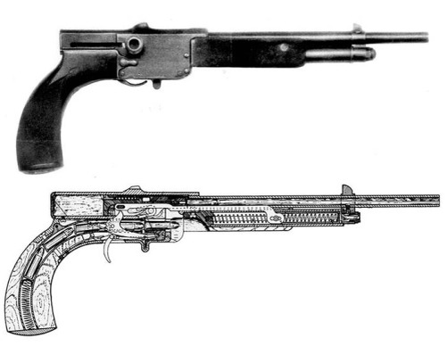 Почему я заострил на этом внимание? Потому что к 1898 году неугомонным братьям пришло в голову использовать их запатентованную систему еще и на пистолете. С точным, насколько это возможно, переносом компоновки ружья: