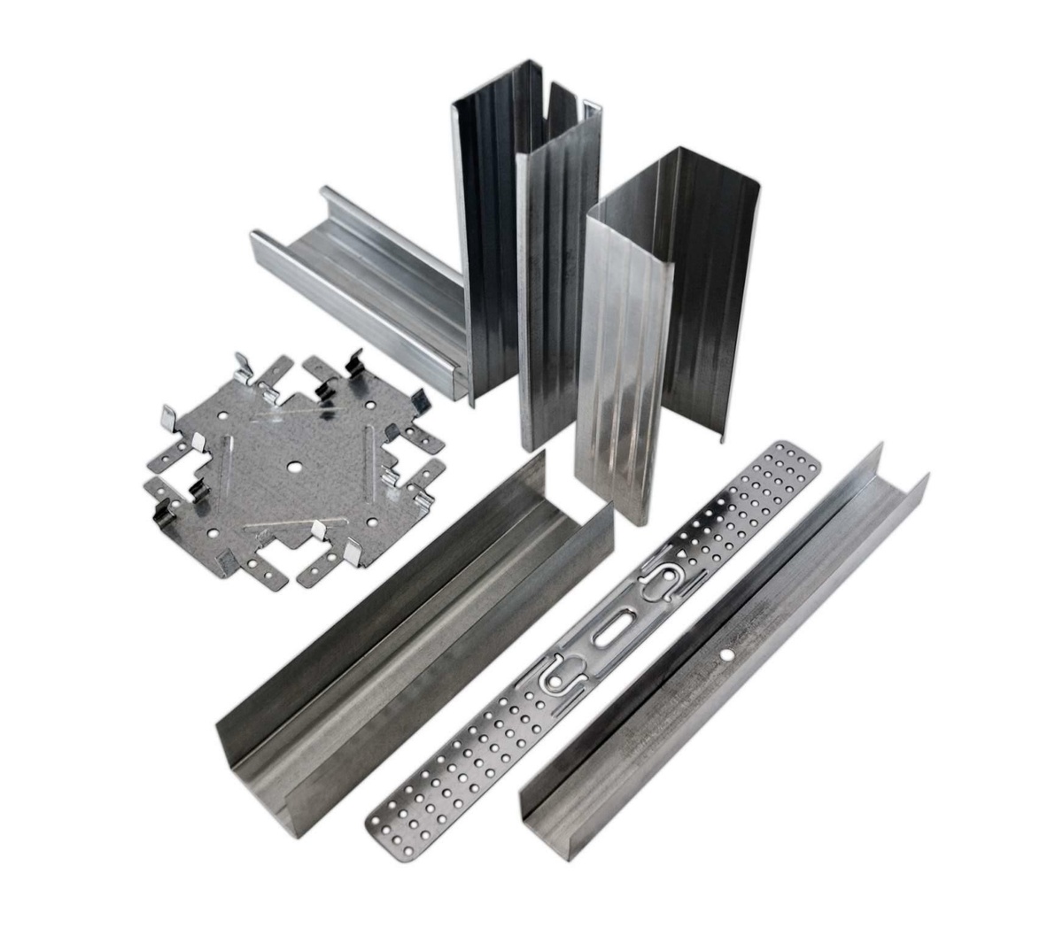 Комплектующие к профилю изготавливаются из высокопрочных металлических сплавов. Отличаются высокой прочностью, долговечностью, простотой монтажа, а слой цинкового покрытия обеспечивает дополнительную защиту от коррозии.
