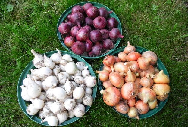Репку выращиваю разных цветов. Красный у меня, как правило сладкий. Помните, знаменитый ялтинский? Мой раза в три поменьше, зато по вкусу не уступает! Сорта перепробовал разные. Друзьям советую из красных Рэд барон и Кармен . Всем хороши! Белый – острый. В прошлом сезоне неплохо себя показал Сноубол . И урожайный, и под селедочку хорош! Ну а обычный золотистый, чаще всего самый популярный в России Штуттгартен ризен . Летом вся зелень с многолетних луков. Батун, шнитт, слизун, душистый, многоярусный… Разные на вкус, почти без запаха, кладезь витаминов. Плюс бесподобно цветут, привлекая пчел и множество других полезных насекомых!