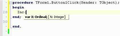 Например, процедура Inc() может увеличивать значение переменной не только на единицу, но и на произвольное число - у неё есть второй параметр, отвечающий за эту величину, но параметр этот необязательный. Таким образом, если второй параметр указан - функция прибавляет указанное число единиц, а если параметр отсутствует - прибавляет единицу, которая задана как значение этого параметра по умолчанию. Понять, какие параметры обязательные, а какие - нет, можно по всплывающей подсказке с параметрами функции, которая появляется после набора открывающей скобки в редакторе кода: