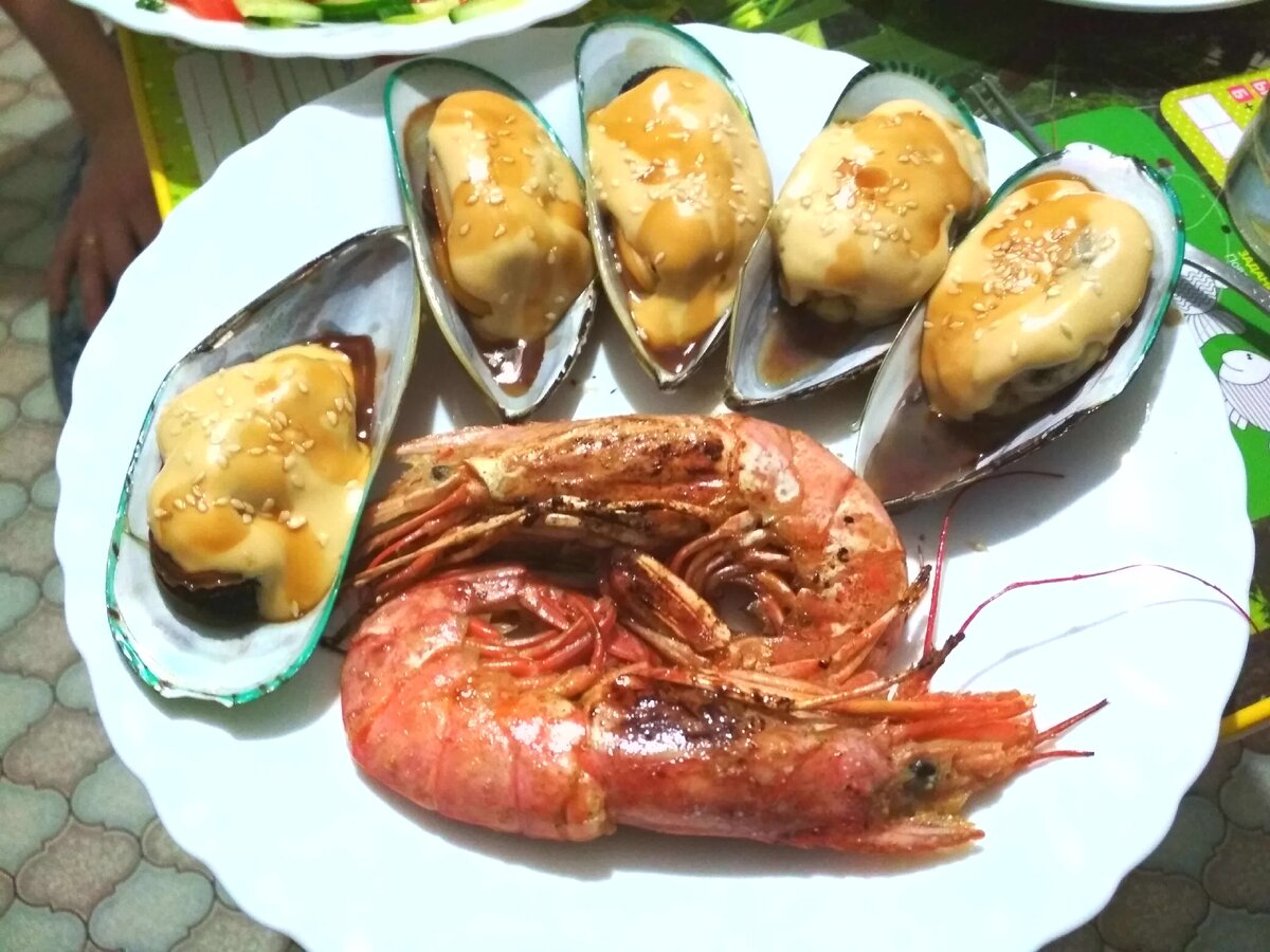 Мидии, запеченные с рисом под соусом терияки