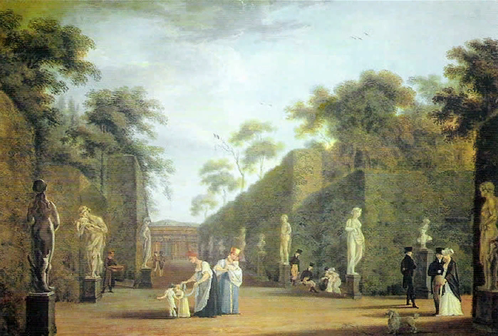 Первый Летний сад (от Невы до Поперечного канала) был регулярным: с прямыми симметричными аллеями, с беседками,со скульптурами и деревьями, подстриженными в форме геометрических фигур.
