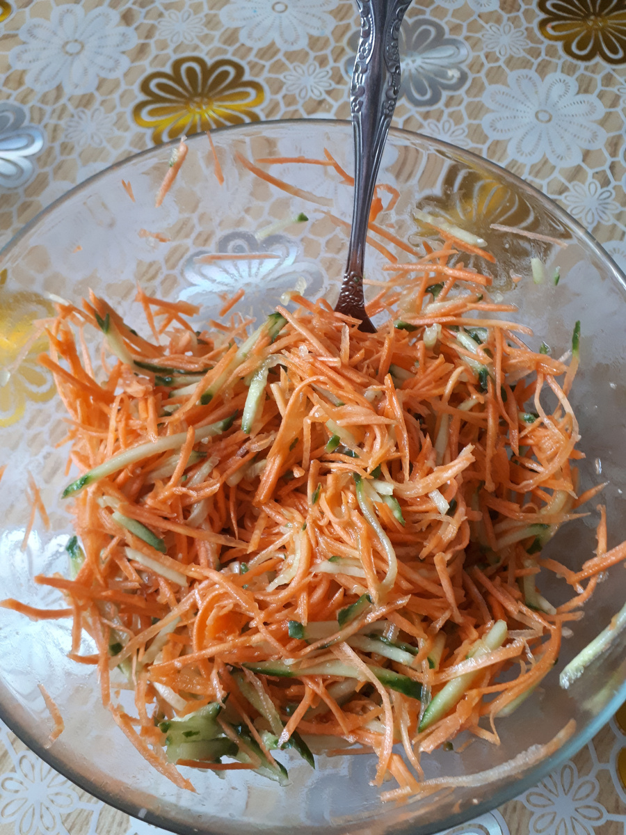 1 огурец 1 морковь натереть на корейской терке, 1 дольку чеснока порезать мелкими кусочками, либо раздавить чеснодавкой.