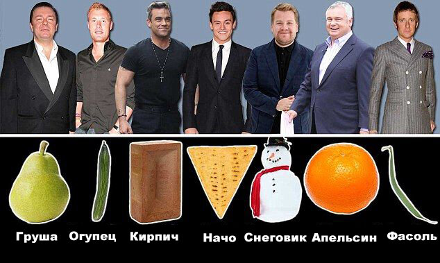 Согласно новому исследованию, британских ученых, современных мужчин можно отнести к одному из 7 основных типов фигур: «помидор», «огурец», «начо», «фасоль», «груша», «кирпич» и «снеговик».