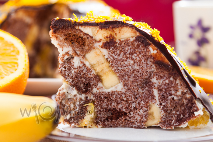3. Накрываем пищевой пленкой и убираем ненадолго в холодильник. Подготавливаем фрукты, очень вкусно получается с апельсином и бананом. Натираем немного цедры апельсина, не доходя до белых волокон. Нарезаем бананы и апельсины.