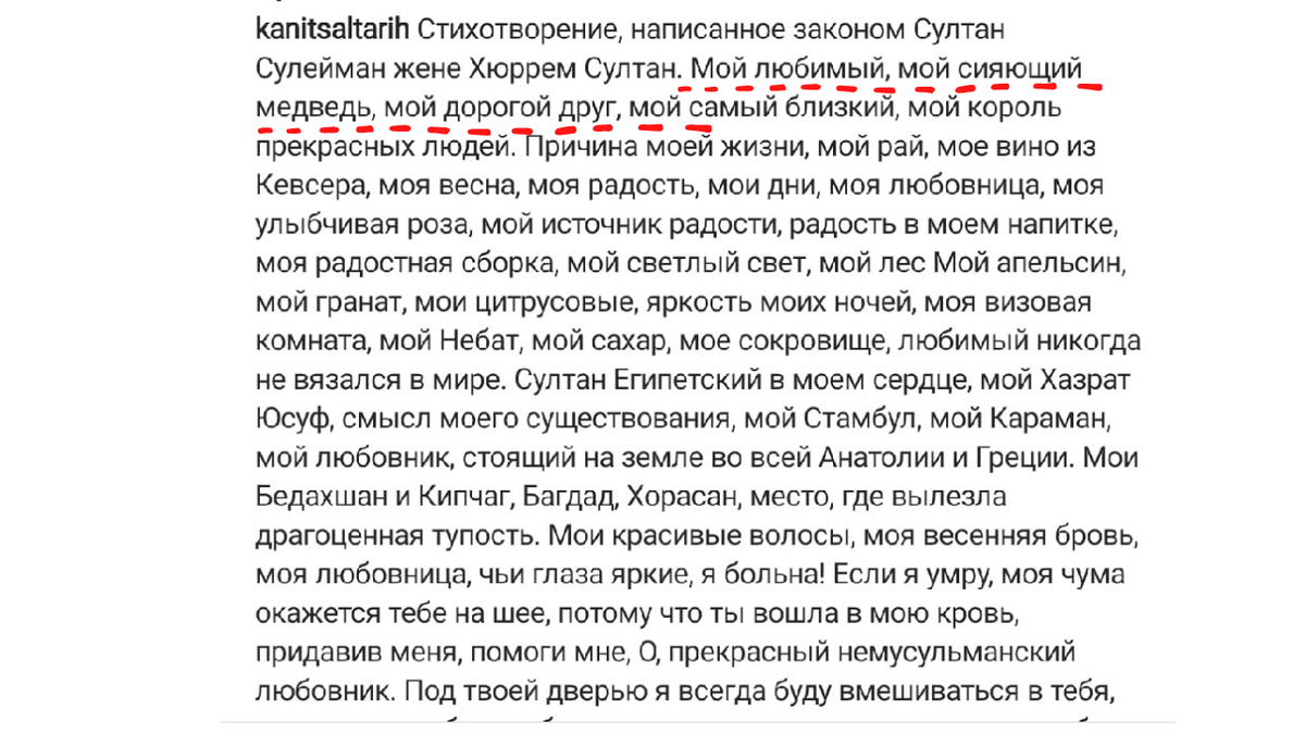 Да-да, именно так, по версии переводчика в Инстаграм, султан Сулейман Кануни назвал в одном из стихотворений свою любимую Хюррем.