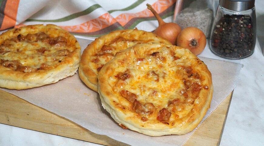 Начинку выложить на лепешки . Края смазать яйцом. Выпекать в духовке при температуре 220 град. примерно 15 мин. Вынуть из духовки, посыпать тертым сыром и вновь поставить в духовку, пока сыр не расплавится.