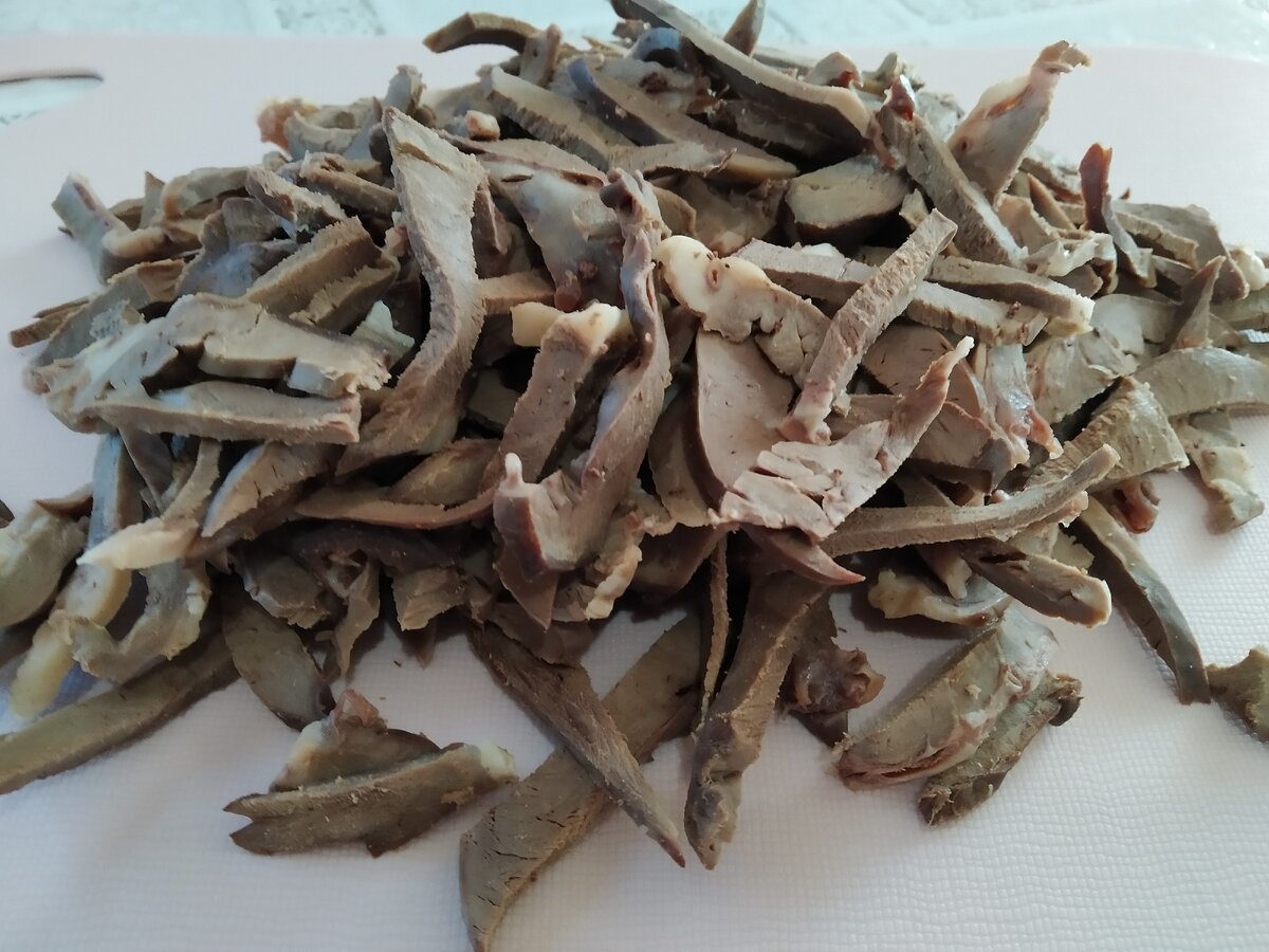- Сердце отвариваю до готовности. Нарезаю соломкой.