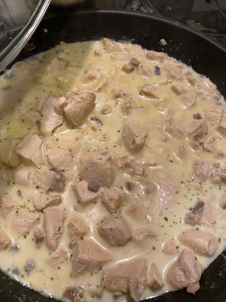 Пока курица готовиться , нарезаем мелко шампиньоны , можно сразу купить нарезанные и сэкономить время . Так же можно использовать замороженные ( но я не рекомендую ), но отправлять на сковородку их надо будет раньше .