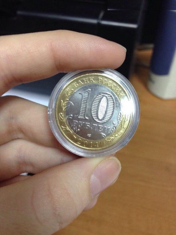 Многие видели эту монету, у кого-то она есть в коллекции. Данный экземпляр был отчеканен на Санкт-Петербургском монетном дворе и на реверсе его поместили Крым с датой присоединения. Монета была отчеканена тиражом в 10 миллионов штук, что является неким стандартом для современной юбилейки. Поэтому и цена на нее небольшая - рублей 40. И то это за монету в отличном состоянии сохранности, смотрим Таганский ценник.