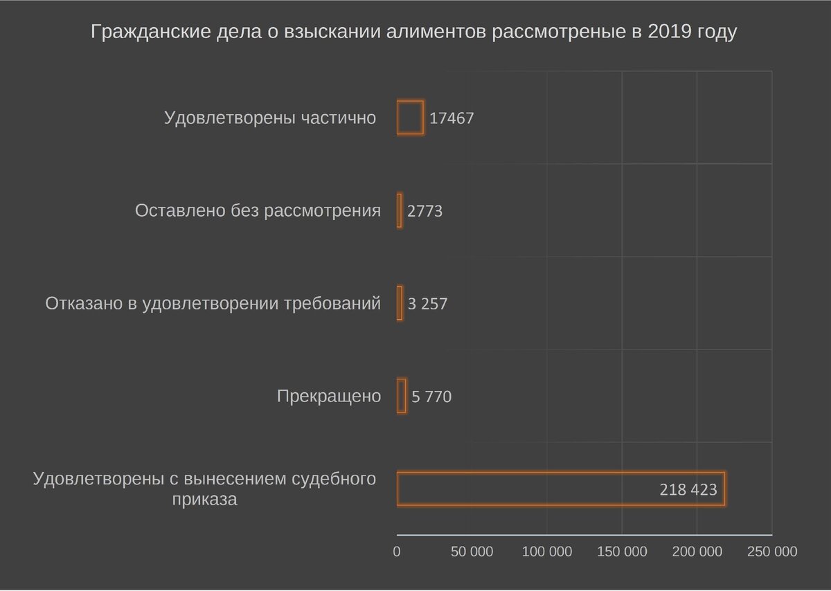 Согласно официальной статистике рассмотрения гражданских споров в судах о взыскании алиментов на несовершеннолетних детей мы имеем следующую картину. Судебный приказ используется взыскателями как основной инструмент в подавляющем большинстве случаев.