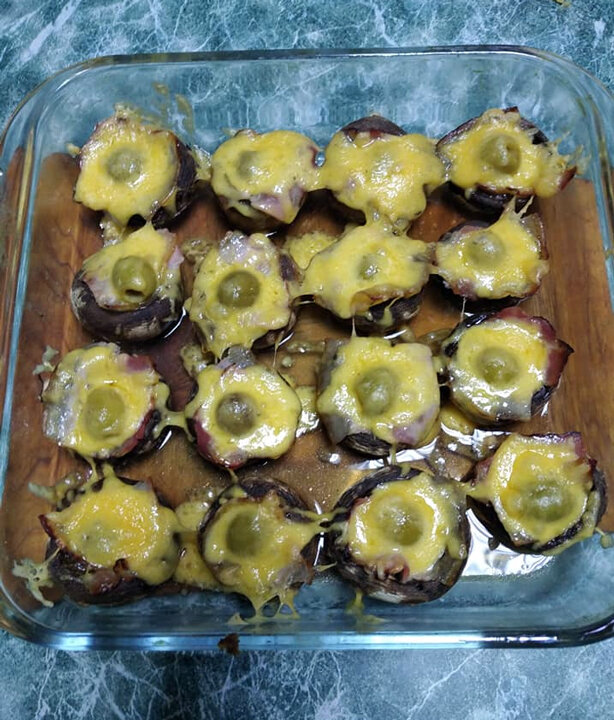В шляпки укладываем квадратные куски ломтиков бекона, а на них - оливки. И посыпаем тёртым сыром. Для любителей острого можно ещё посыпать молотым чёрным перцем (лучше из мельнички - ароматнее).