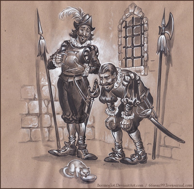 Полицейские, Тод и Регалт, не торопясь шагали по грязной извилистой улочке, немного скучная от рутинной работы. На дежурство они заступили вчера вечером, ночь прошла спокойно, они неплохо поспали в одном из местных трактиров, где его хозяин, не первый год знавший эту парочку, и находясь с ними в довольно неплохих деловых отношениях, ещё и накормил их вкусным ужином. Тод и Регалт несли службу вместе почти десяток лет и уже хорошо знали друг друга. Знали все мелкие привычки каждого, знали личную жизнь, вплоть до того, как ходят по большому их дети, и как стонет жена каждого по ночам во время этого самого дела. Можно сказать они были друзьями. Сегодня Тод был немного не в настроении, из-за небольших размолвок в семье и Регалт старался лишний раз не задевать его, предпочитая самому не заводить разговоров, а оставить эту прерогативу за другом, за что тот ему был естественно благодарен.