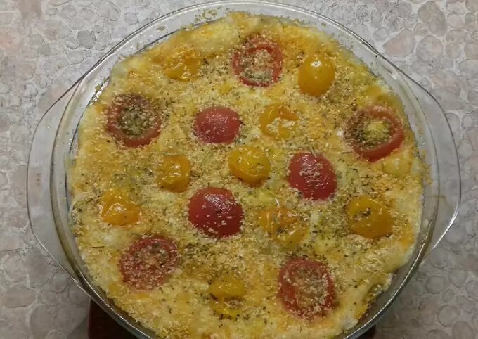 - Половинки помидоров выложить на тертый сыр и отправляем запекаться в духовку в течении 10 минут при температуре 180-200 градусов