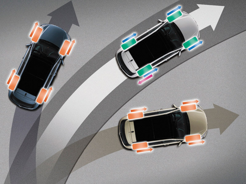 Способ воздействия этой системы на ситуацию это притормаживание каких-либо колес, передних или задних, неважно, в зависимости от ситуации. Второй способ управления или воздействия на ситуацию этой системы, это снижение оборотов двигателя, то есть если вы слишком быстро вошли в поворот, система снижает подачу топлива двигателя, и автомобиль притормаживает. Таким же способом, может быть пониженная передача, в автоматической коробке передач, то есть без вашего ведома, передача переключится на пониженную. Третий способ воздействия этой системы на управляемость, это поворот колес. В современных автомобилях возможны случаи, когда эта система может повернуть колеса, независимо от вашего воздействия на руль.