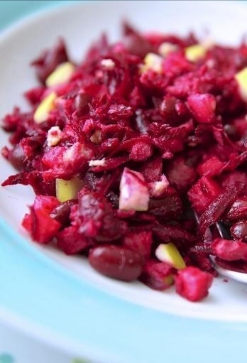 Фасоль необходимо замочить на ночь, отварить до готовности. Свеклу, морковь, огурец нарезать кубиками . Смешать все ингредиенты, заправить любым растительным маслом. Можно украсить веточками зелени.