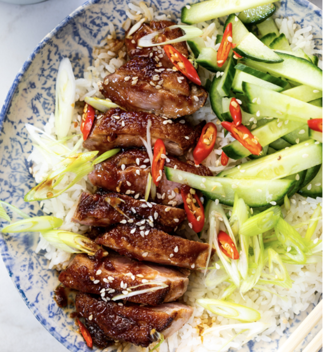 - Подача: нарезать утку и подавать с отварным рисом с огурцом, зеленым луком и красным перцем чили. Полить соусом и подавать.