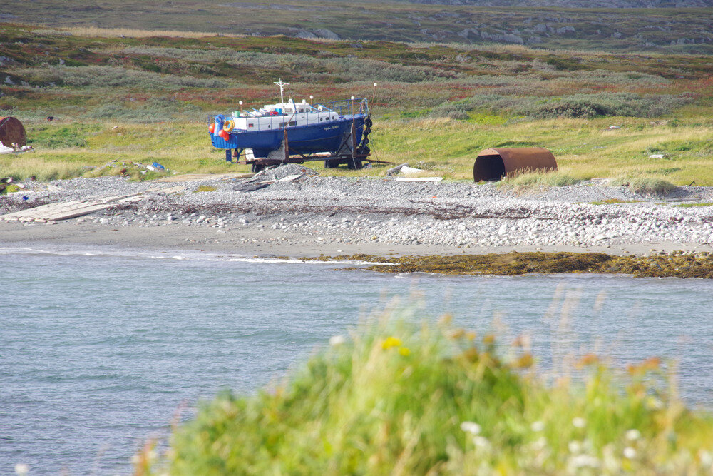 На прогулку по мысу Цыпнаволок потратили около часа. Когда вернулись к машинам и собрались уже уезжать, к нам на Урале подкатили военные. Думал наезжать начнут, мол что вы тут делаете и т.п., но нет, молодой капитан оказался вполне вменяемым и приятным человеком, расспросил как дорога, куда едете и т.п. в конце пожелал нам удачи и уехал на базу. Ну а в добавок, когда выезжали с мыса, Саня пробил колесо, но все решилось за 10 минут, поставили жгут и поехали дальше, на мыс Сергеева.