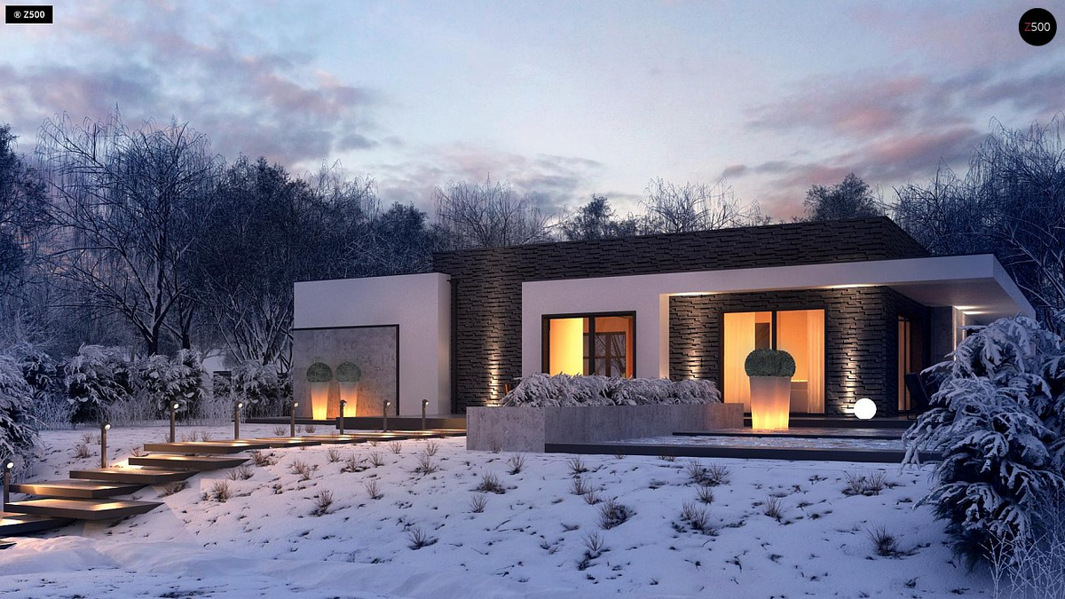 Zx96 представляет собой проект современного одноэтажного дома с интересной планировкой и гаражом для одной машины.