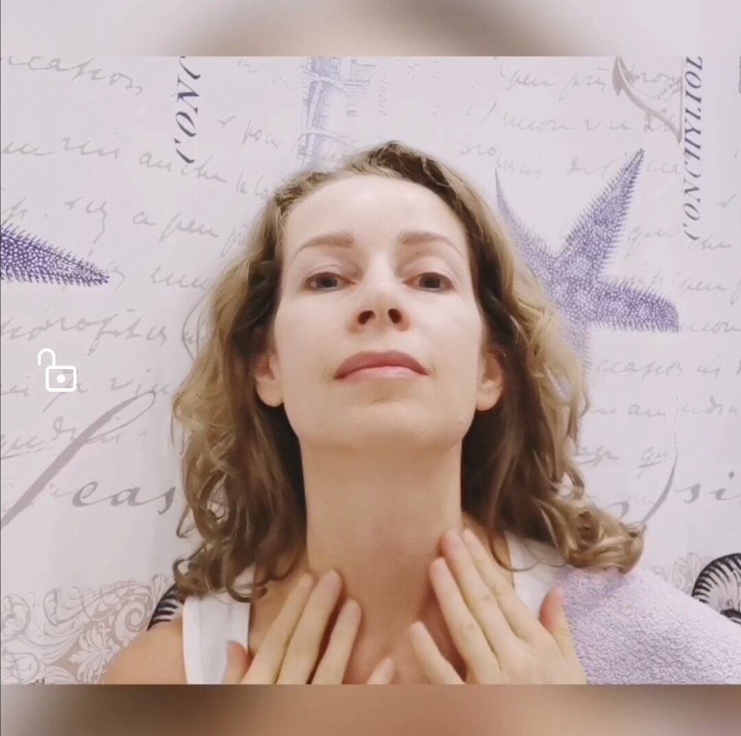 👉 Обнимаем ладонью переднюю часть шеи и легко поглаживаем её от подбородка до ключиц.