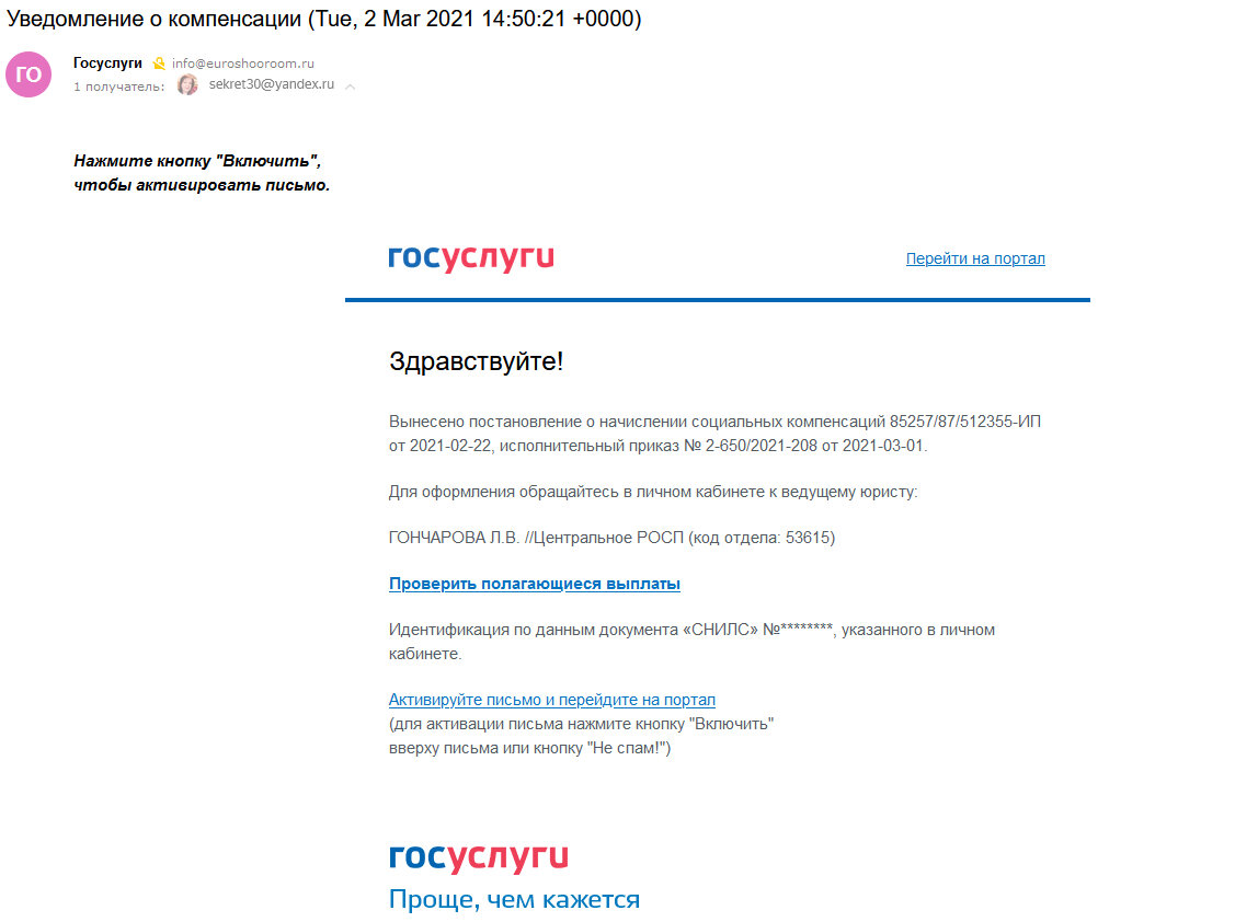 Было письмо якобы от Госуслуг со следующим содержанием: