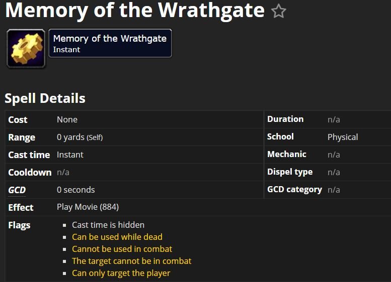 Игроки нашли в файлах патча 9.0.5 на тестового мире World of Warcraft: Shadowlands эффект Memory of the Wrathgate, воспроизводящий некий ролик. На данный момент он активирует видео из дополнения Battle for Azeroth , но, судя по всему, это временно, а настоящий ролик игроки увидят в будущем.