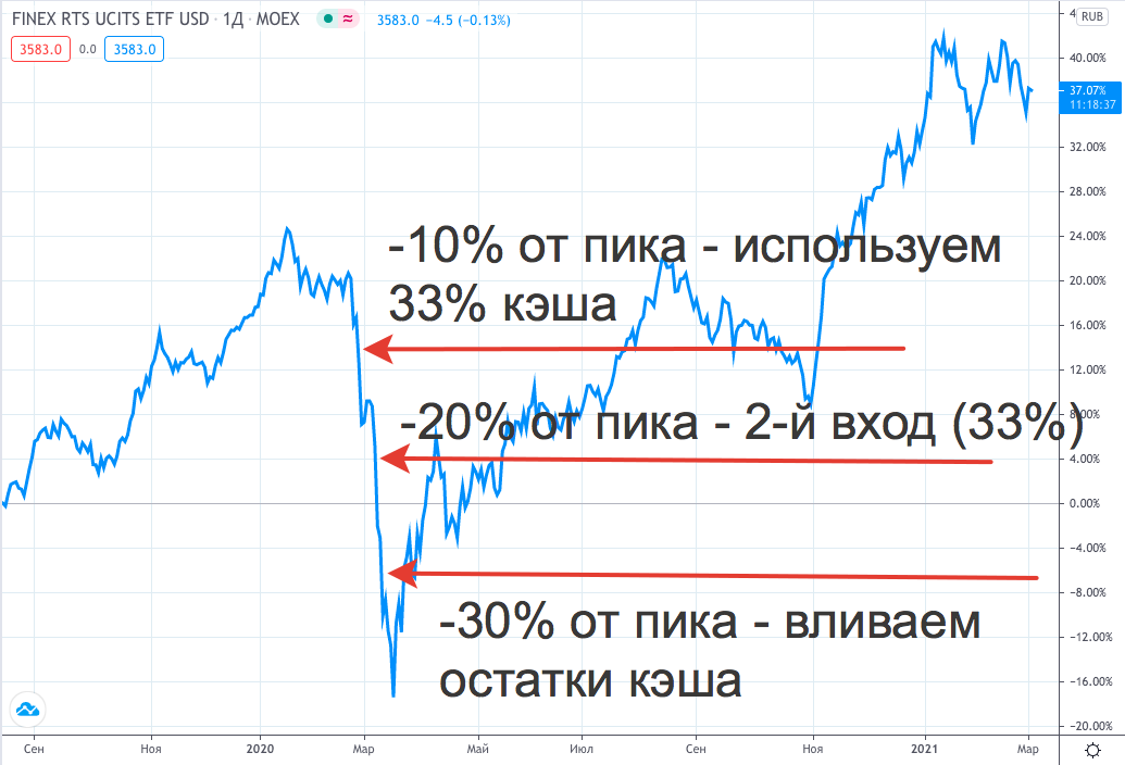 Допустим у нас был следующий алгоритм использования кэша: на каждые 10% падения рынка (фонда) вносить треть от заначки. То есть стратегия рассчитана на максимальное падение 30%.