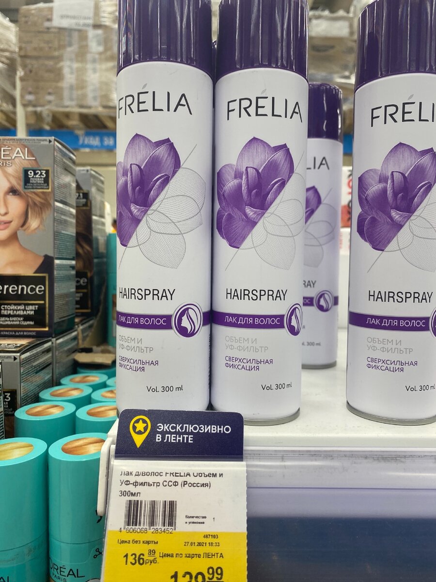 Некоторые товары эксклюзивные для магазинов. Например, лак для волос, который можно найти только в "Ленте". Стоимость без карты 136,89р, а по карте 129,99. Хотя и небольшая скидка, но все равно приятно. Объем баллона 300 мл, лак супер фиксации.
