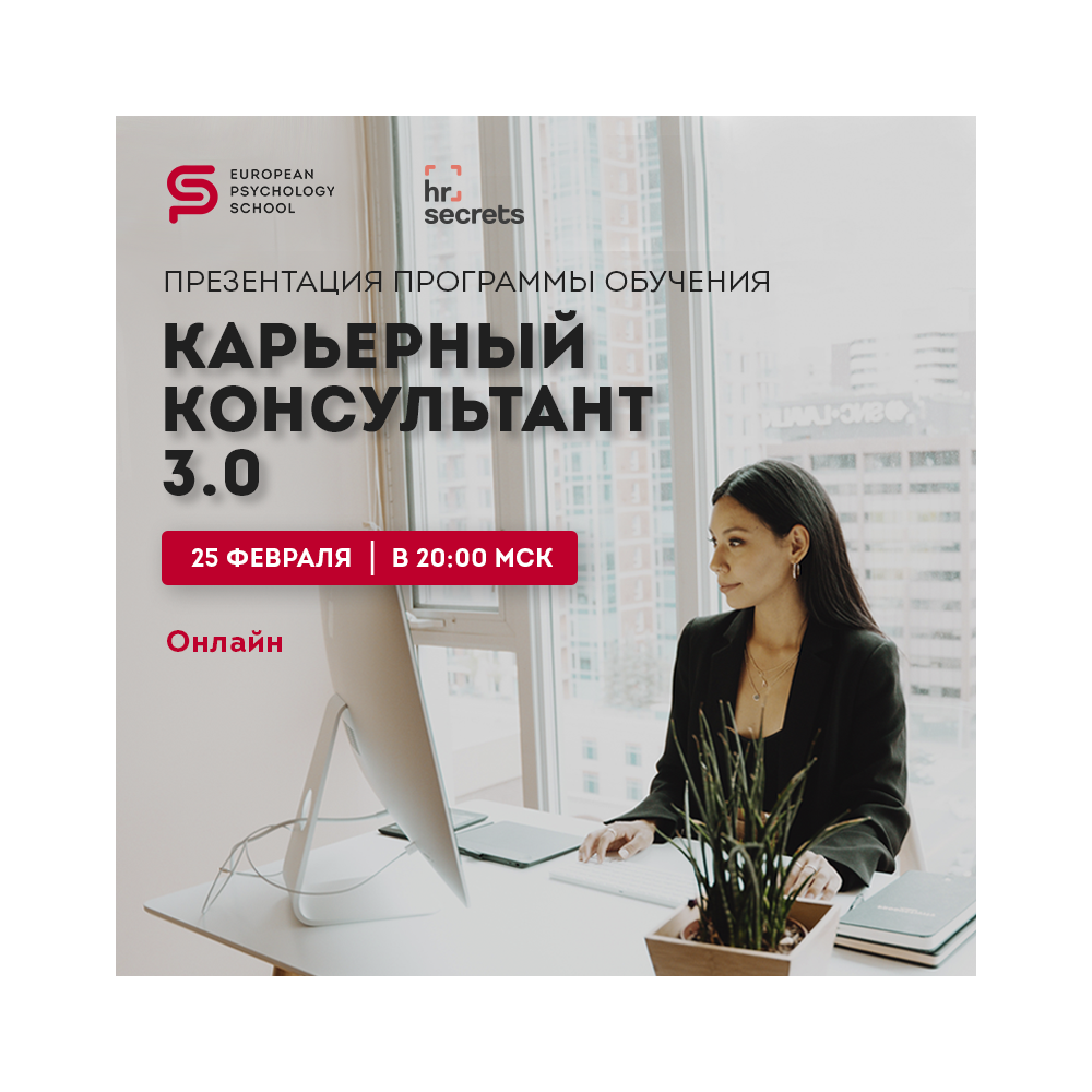 25 февраля в 20:00 по Москве Кристина Кудрявцева, основатель Европейской Школы Психологии, и Наталья Токарская @hr_secrets проведут онлайн-презентацию образовательной программы «Карьерный Консультант 3.0» и расскажут: