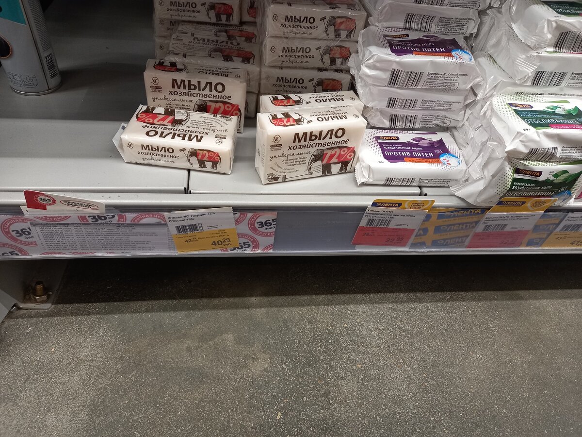 Лента - такой большой магазин, а выбора хозяйственного мыла нет. Единственный вариант - кусочек на 180 г за 40 рублей. На мой взгляд дороговато для хоз.мыла. Я его не пробовала, а за такую цену даже не возникло желания этого сделать.
