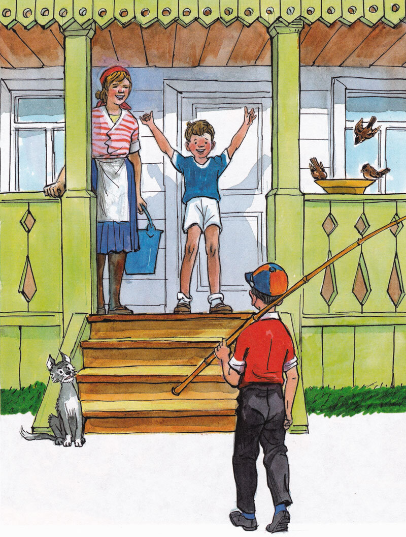 Потом мама уехала, а мы с Мишкой решили пойти на реку рыбу ловить. Наладили удочки, накопали червей.