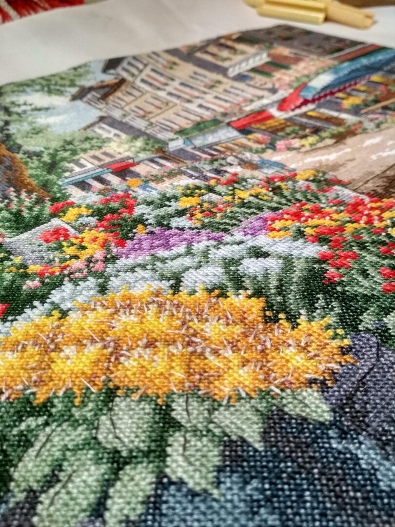 Есть такое сочетание слов "Увидеть Париж и умереть!", довольно странное, но да ладно. Я мечтаю увидеть Париж, попробовать знаменитых круассанов, выпить французского вина(хоть и не пью алкоголь), прогуляться по узким улочкам, подняться на Эйфелеву башню, посетить Парижский Дисней ленд, побывать в картиной галерее....ну и еще много чего бы сделала. Все стандартно. И чтоб хоть как то прикоснуться в Парижу, я вышивала такой сюжет от Дим. Очень запал в душу, вышила на одном дыхании, все эти мелочи, маленькие человечки, фрузелки на цветах, надписи, в этом сюжете столько всего потрясающего. Много бэка как я люблю, есть крестики и полукрестики. В этой работе я люблю все: и домики и цветы и небо....ВСЁ. Я словно дышу этим воздухом....Так и хочется пройтись по этому рынку.