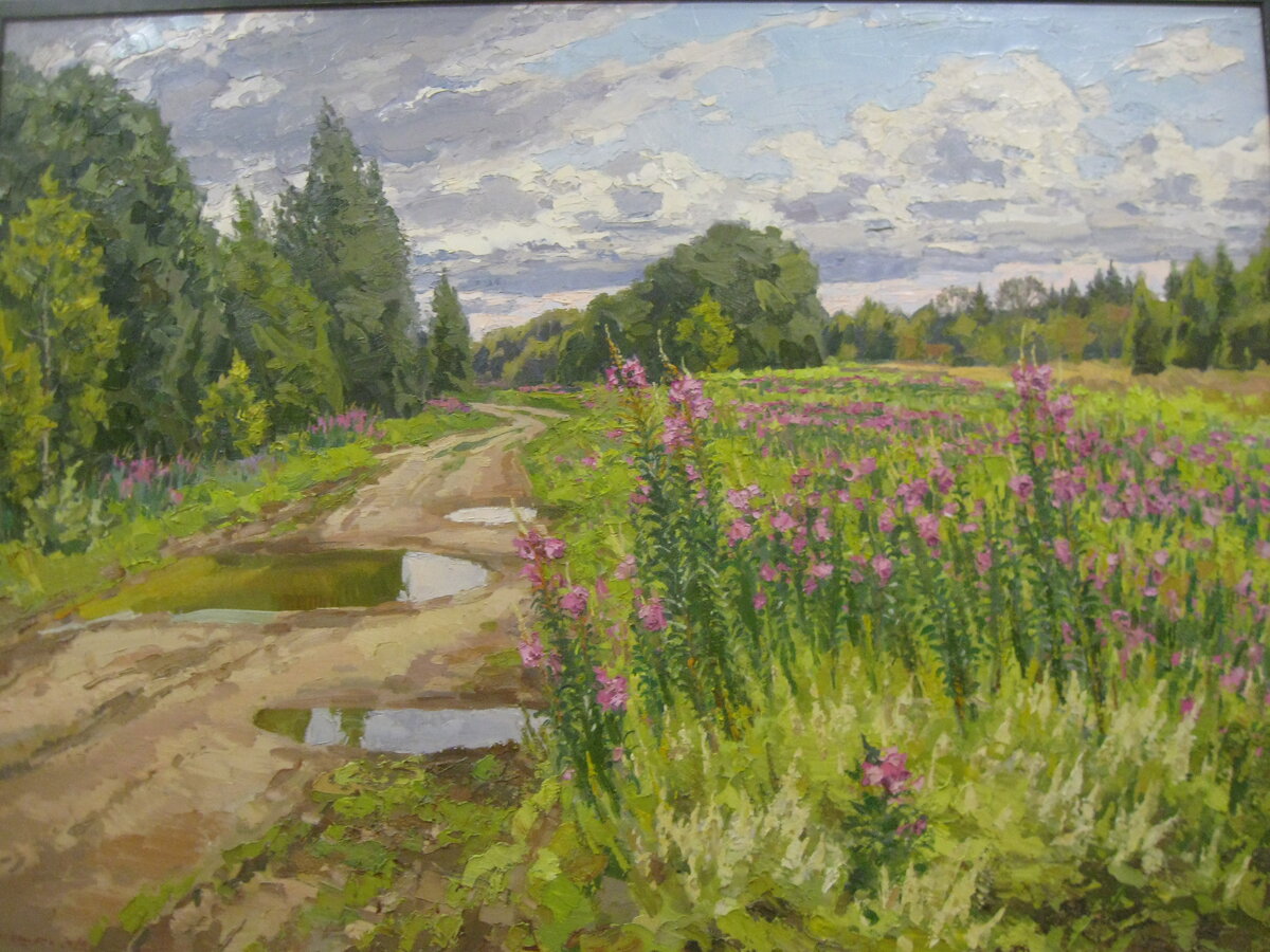 На персональной выставке в ВХМ выставлены картины последнего десятилетия творчества живописца. Это пейзажи разных стран и городов, в которых работал художник: Китай, Франция, Швеция, Алтай, Париж, Владивосток, Москва, Киров, Переславль-Залесский, Уржум. Ромашко фиксирует уникальные виды французских городов, русских деревушек, исторических комплексов. Меня, честно, больше зацепила наша вятская глубинка, может потому что я не была в дальних заморских странах. Художник сам для гостей повел экскурсию, подробно рассказывая о своих картинах. А я отошла от общей группы, чтобы поближе рассмотреть улочки старинных городов, полюбоваться полями шикарных люпинов, найти знакомую улочку Уржума или Кирова на полотне художника. Остановившись у картины, на которой изображена деревенька с покосившимися домами зимой, я вспомнила кусочек произведения Владислава Крапивина «Старый дом»: