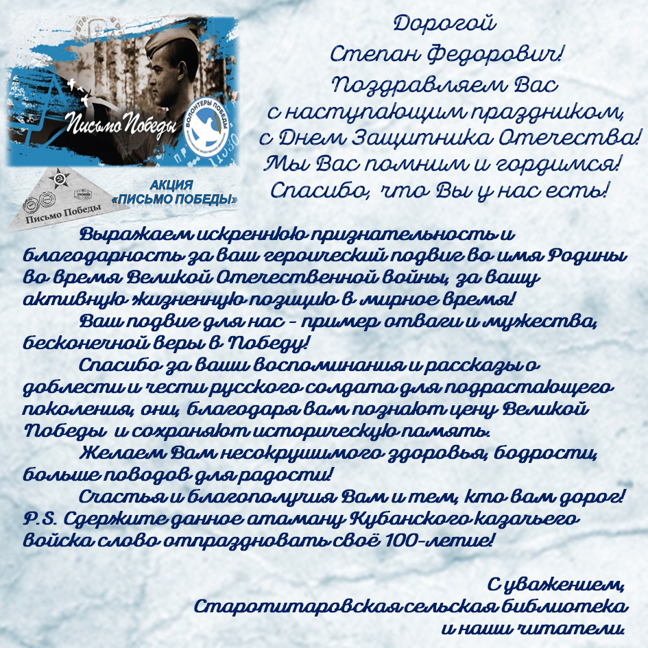 СТАРОТИТАРОВСКАЯ СЕЛЬСКАЯ БИБЛИОТЕКА ПОЗДРАВЛЯЕТ С НАСТУПАЮЩИМ ДНЕМ ЗАЩИТНИКА ОТЕЧЕСТВА НАШЕГО ВЕТЕРАНА СТЕПАНА ФЕДОРОВИЧА АЛЕЩЕНКО!