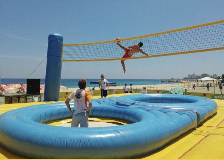 В игре участвует две команды по 4-5 человек в каждой. Они бросают мяч через сетку, напоминающую волейбольную. Место игры – большой батут с высокими бортами, в поле каждой команды в центре расположен надувной валик,