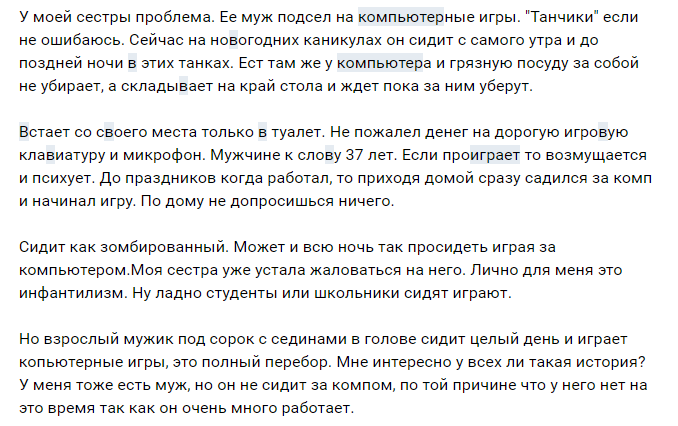 Мне часто в интернете встречаются слезливые посты молодых девушек, которые только что вышли замуж, родили ребёнка, а муж уже сутками просиживает за компьютером.