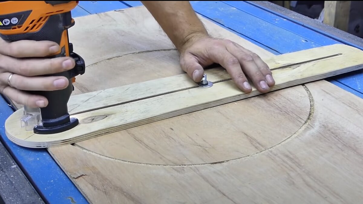 Всем привет друзья, сегодня сделаем полезную самоделку своими руками. Нам понадобится фанера толщиной 10мм, для начало отступаю от края 10см, и провожу центральную рабочую линию. Далее беру отрезной круг, его диаметр отлично вписывается под нашу задумку. Теперь нужно задать длину рабочий зоны и конечную точку. Рабочая зона у меня будет в 50см а общая длина заготовки 70см. От центральной линии отступаю по 1-му см с каждого края и провожу линию, а потом боковые завершающие чистовую площадку. Для удобства работы начертил заготовку прямоугольной формы, прижал струбцинами к верстаку и вырезал лобзиком. Далее закрепляю заготовку к столу на саморезы и фрезером делаю паз по центру, глубиной прохода 4мм. И также повторяем с другой стороны. Далее на ленточной пиле вырезаю по заданной разметке, чтобы получить чистовую деталь. Немножко шлифуем и заготовка готова. Далее нам понадобится металлический уголок диаметром 4мм, отрезаем отрезаем кусок, и сглаживаем на куске металла углы. Далее ширину дели