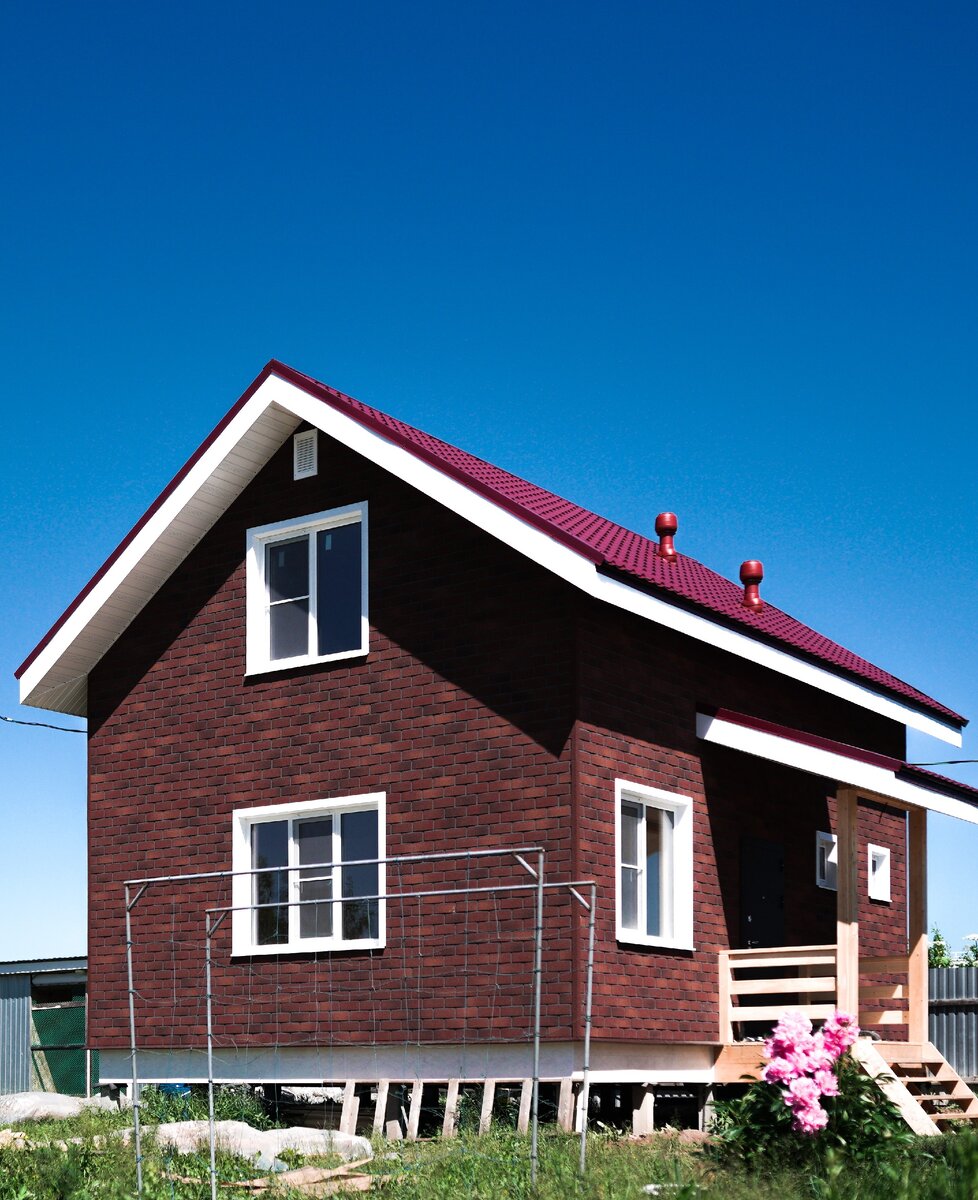 Кровля простая двускатная – покрытие металлочерепица. Внешняя отделка уже знакомый вам материал Хауберг от Технониколь , фактура «терракотовый кирпич».