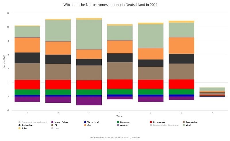 Энергосистема ФРГ прошла штормовую погоду без потерь. В период с 01 января по 15 февраля 2021 года «заваленные снегом» солнечные панели и «замерзшие» ветряные турбины произвели 27,2% электроэнергии. Да, меньше, чем за аналогичный период прошлого года, но много, очень много. На графике ниже показана выработка по неделям. Обратите внимание на отрицательное импортное сальдо внизу – в каждую из этих недель Германия экспортировала больше электричества, чем импортировала.
