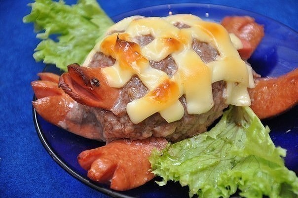 Пластинки сыра нарезаем полосками и в виде сеточки выкладываем на котлету – «спинку» черепашек.