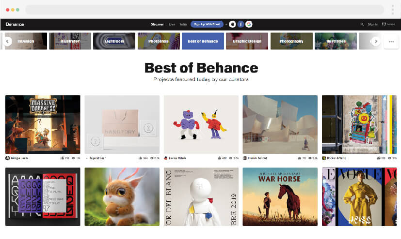 Если вы хотите найти вдохновляющий сайт в определенной области, фильтры категоризации позволят вам выбирать по творческим областям, таким как иллюстрация, игровой дизайн, поделки или творческие инструменты, такие как Photoshop, Illustrator или Fresco. В качестве альтернативы есть общая панель поиска для типизированных запросов, которые также можно фильтровать по местоположению, цвету или даже школам. Behance позволяет вам следить за художниками и досками настроения художников, а также есть Избранная галерея проектов, выбранных кураторами.