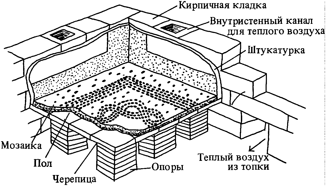 Гипокауст – это такая структура, которая распространяет тепло от печи, находящейся под полом по помещению. Напоминает электрический тёплого пол или привычную нам подачу горячей воды. В Римской системе отопление представляло собой небольшие столбы под напольными плитами с пустотами между столбами.