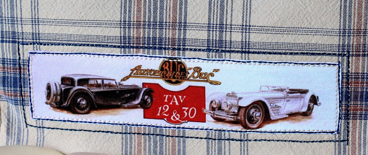 Эмблема на картинке с ретро автомобилями ярко-красного цвета, поэтому хлястик на застежке я также сделала из красного хлопка, чтобы поддержать яркий акцент.