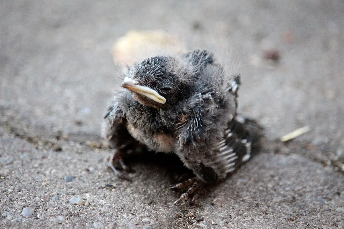 И вот, проходя возле большой ели, внучка вдруг свернула с тропинки и начала что-то разглядывать в невысокой траве. Я подошёл и тоже увидел небольшой чёрный комочек с клювиком. Он не издавал никаких звуков, даже не пытался убежать. Понятно было, что птенец сильно ослаб.