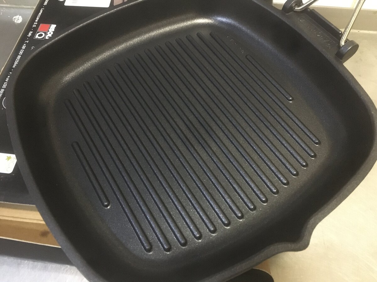 Давно хотел на кухню сковороду с гриль поверхностью. А эта ещё и тефлоновая. Сковорода имеет съёмную ручку с деревянной вставкой. Очень удобно отстегнуть её и мыть в посудомоечной машине. Металл довольно толстый. При этом сковорода лёгкая, ведь в основе - алюминий. Сбоку имеется слив, на случай, если вы переборщили масла.