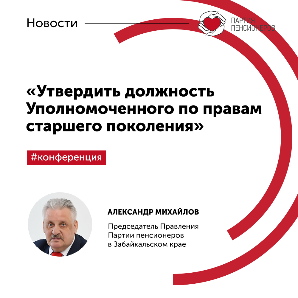 «В своем выступлении на конференции «Партия пенсионеров – стратегия для всех поколений» в очередной раз подчеркнул актуальность нашего требования о скорейшей необходимости утверждения должности Уполномоченного по правам старшего поколения», — сообщил Александр Михайлов, Председатель Правления Партии пенсионеров в Забайкальском крае, депутат Законодательного собрания Забайкальского края.
