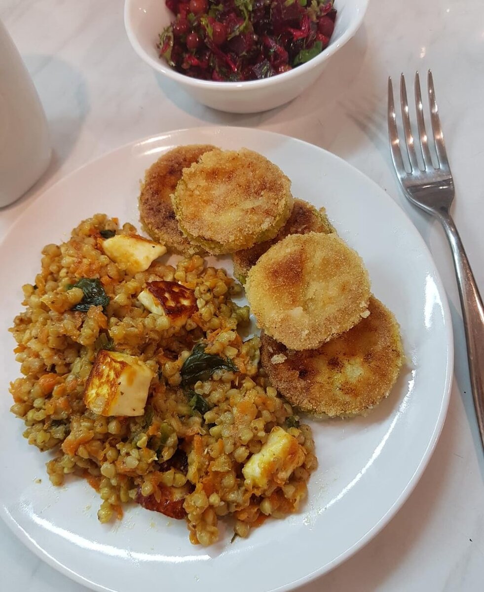 12. Выложить кабачки на тарелку, можно посыпать мелко рубленную свежую кинзу на них. Рядом выложить гарнир. Подавать лучше с салатом.